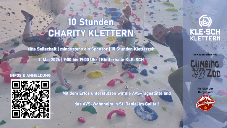 Das Event “10 Stunden Charity Klettern” wird vom Verein ClimbingZoo und zahlreichen mitwirkenden Kletterhallen veranstaltet. Ziel des Events ist es, durch gemeinsames Klettern und Spaß, Geld für einen wohltätigen Zweck zu sammeln.